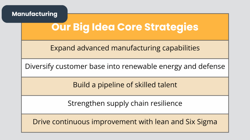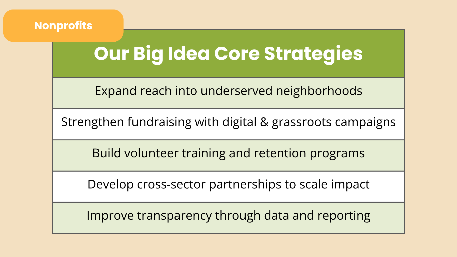 The handful of core strategies that make your plan work. These are the “how” behind your mission—the focused initiatives that bridge vision and execution.
